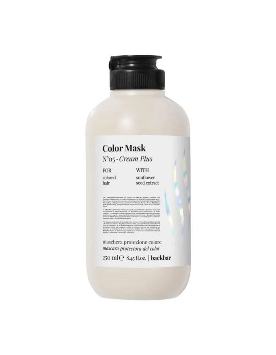 Revitalize and prolong your hair color with Back Bar Colour Mask N°05 - Cream Plus. This nourishing mask is enriched with color-boosting ingredients, delivering deep hydration and revitalization to your hair. It helps restore vibrancy, shine, and manageability to color-treated hair. Experience salon-quality results with this color-protecting mask.