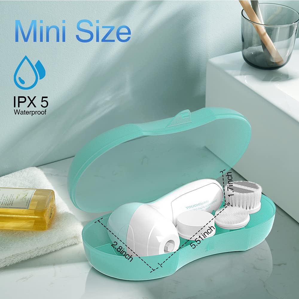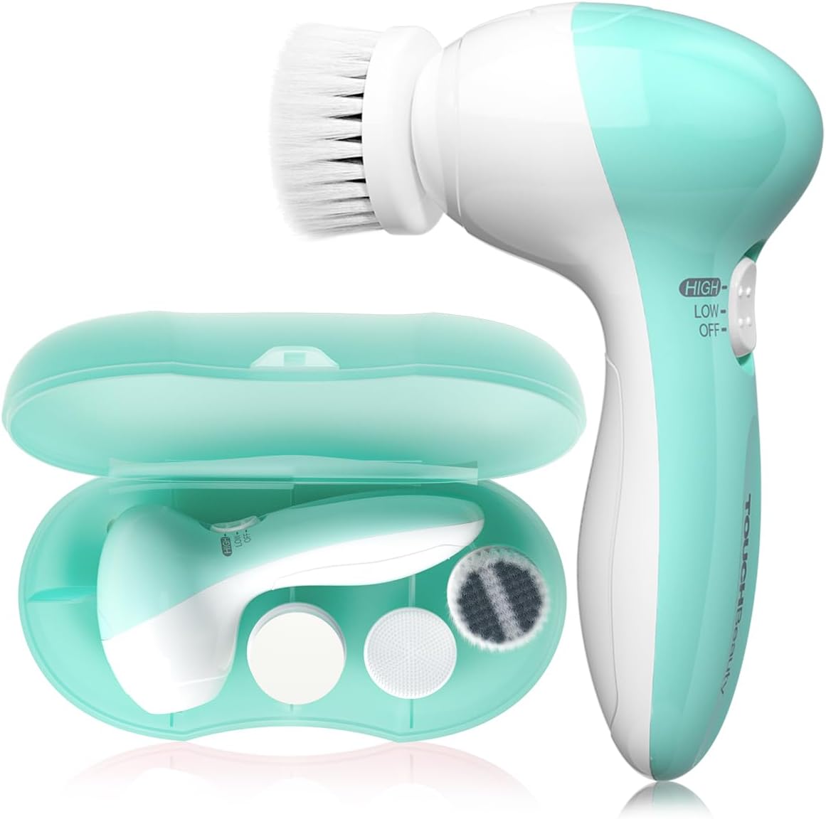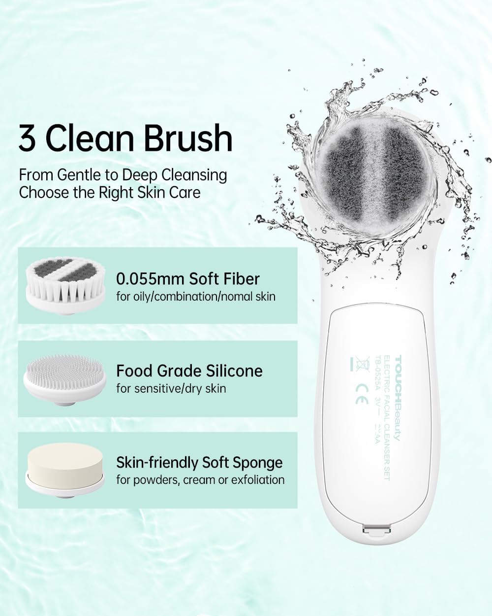 TOUCHBeauty TB0525A Facial Cleansing Brush Set – Electric 2-Speed Face Cleanser with 3 Interchangeable Brush Heads (Silicone Included), 360° Rotating, Battery Operated, Travel Case