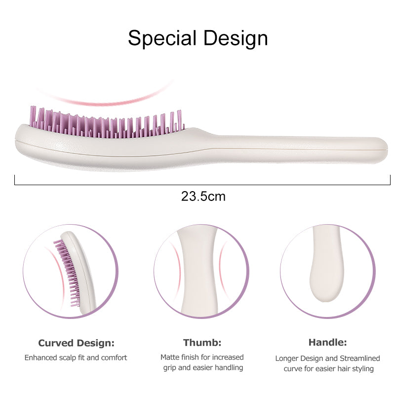 Give your scalp the care it deserves with the Massage Hair Comb C166. Its curved, ergonomic design fits the scalp comfortably, while a long, streamlined handle with thumb matte finish ensures a secure grip and easy styling. Carefully engineered for various hair types, this comb features a combination of hard and soft flexible bristles that glide gently through knots and tangles while massaging the scalp. Perfect for detangling, styling, and promoting healthy hair growth with a soothing massage.